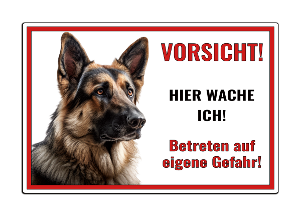 Achtung, wachsamer Deutscher Schäferhund! Dieses komfortable Warnschild mit der Aufschrift „Hier wache ich – Betreten auf eigene Gefahr“ ist ideal für Haus, Garten oder Tor. Ein klarer Hinweis für Besucher – und Ihre Sicherheit.